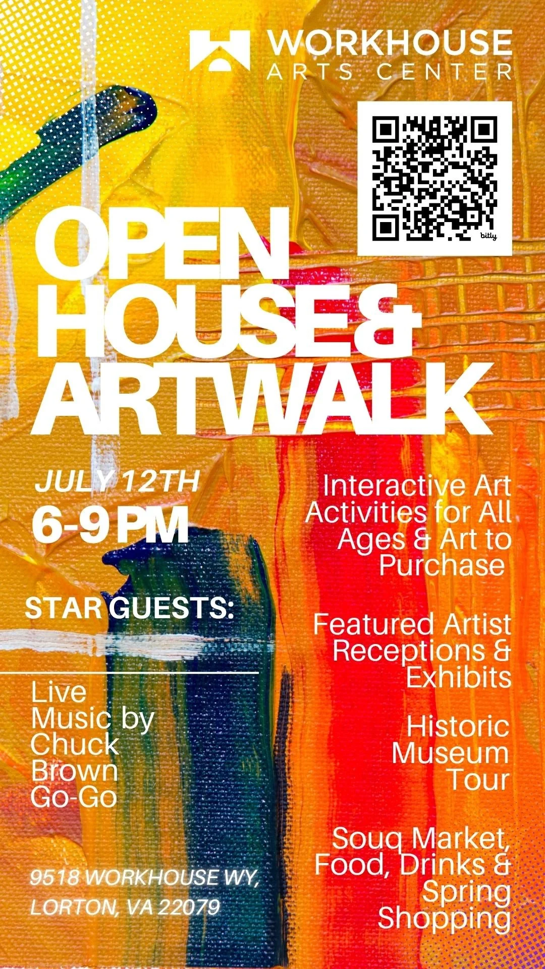 This Saturday, the Workhouse Arts Center invites you to walk into an evening of inspiration, rhythm, and creativity. From gallery openings and live music to interactive art experiences, the campus will be alive with energy—including new exhibitions, open studios, and the Souq Social Market at the baseball field.