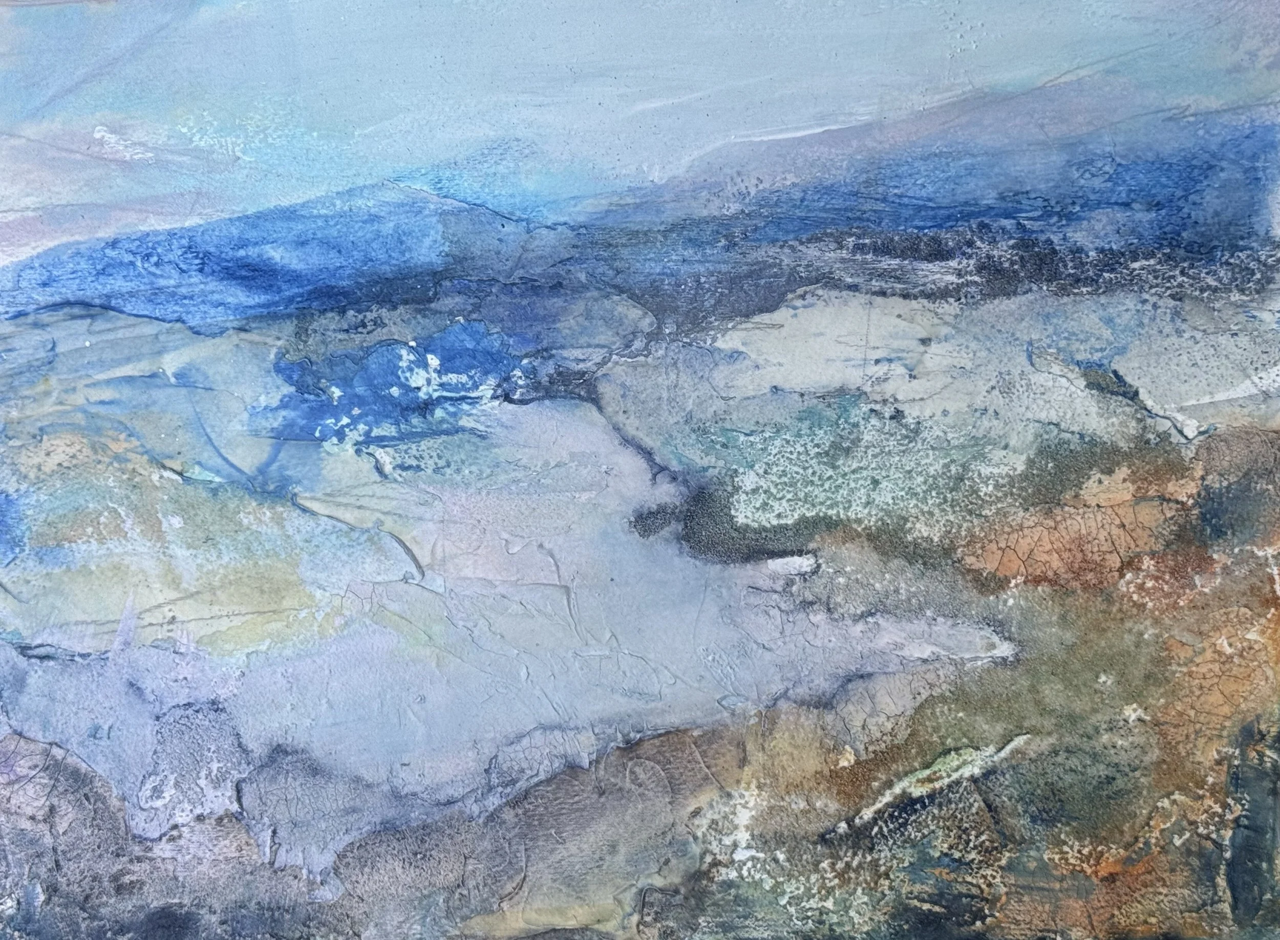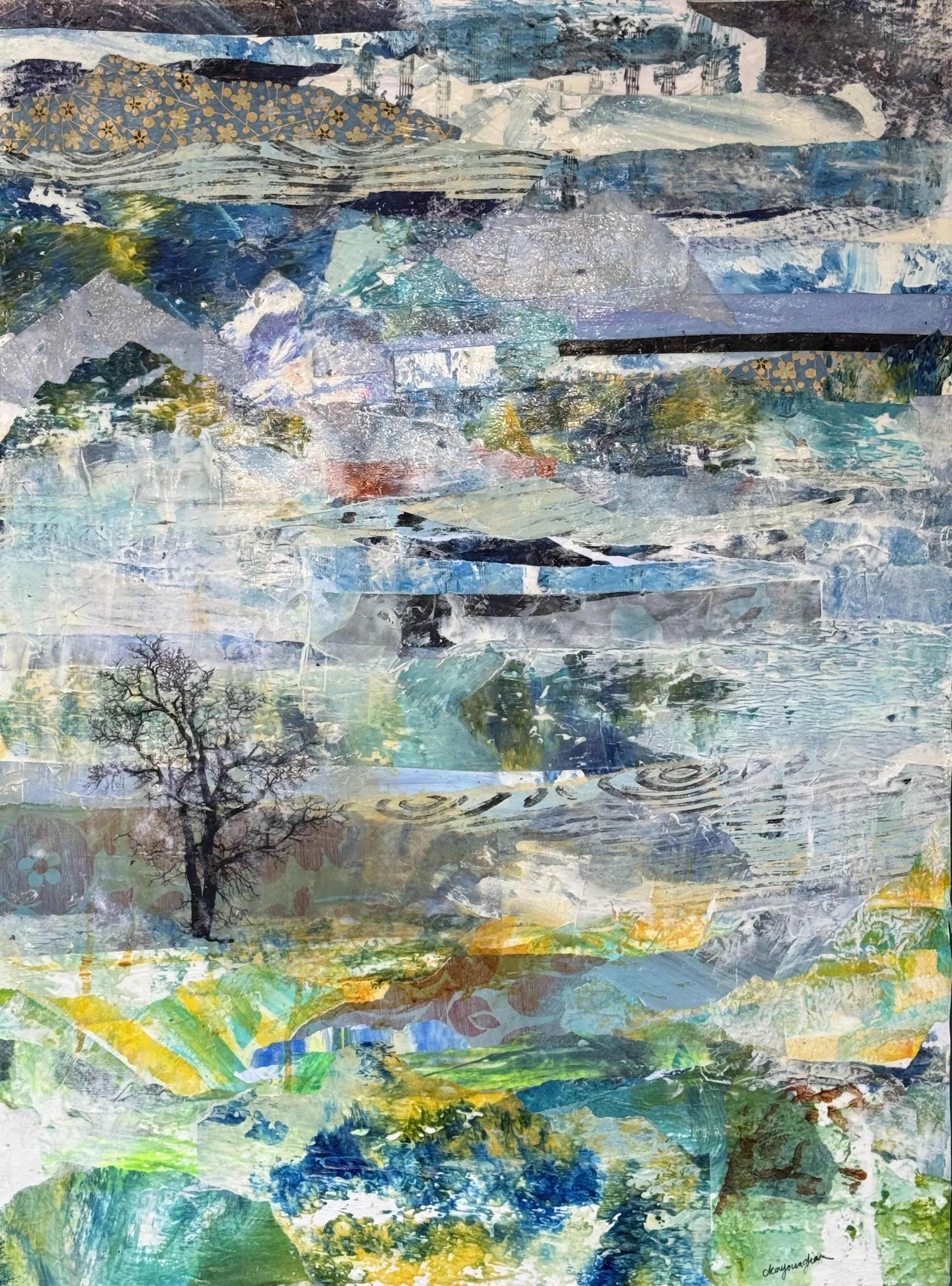 Recognizing that art can never truly replicate nature, Camille instead strives to interpret it. Her work serves as a testament to her deep concern for the changing state of our planet. By incorporating upcycled paper, acrylic, and texture media, she highlights both the fragility and resilience of the Earth. Through her art, she encourages viewers to engage in contemplation, empathy, dialogue, and hope for the future.