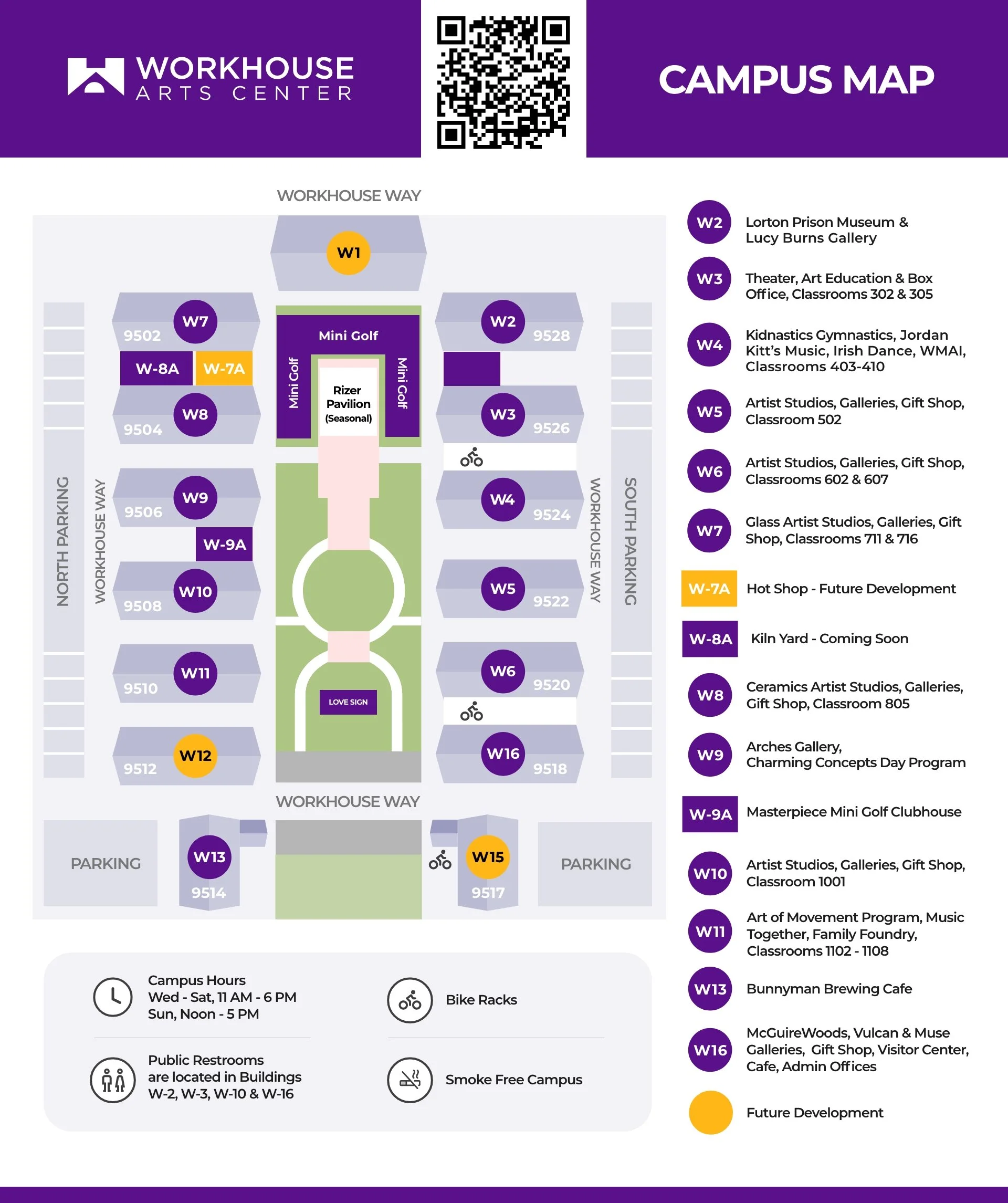 Campus Map For more Workhouse Arts Center operating information, please visit our Visitor Information page.
