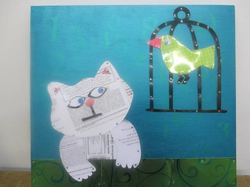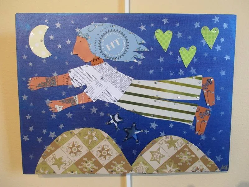 Medium: tin collage, tin and mixed metal jewelry, paper collage, soft sculpture