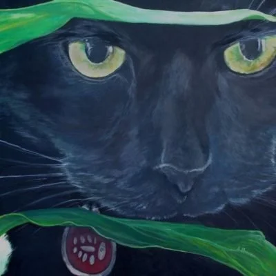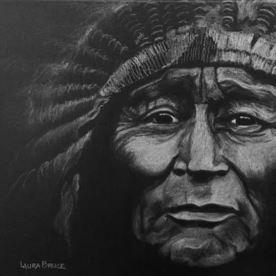 Delving right into a canvas is a typical process when painting. She decides what medium to use, sketches a light outline and then plunges in. When doing a portrait, she usually starts with the eyes then builds the face from there. American Indians are a particular favorite of Laura’s because of the wisdom, pride and sadness their faces can convey. That sadness can draw the viewer in and hopefully a story will unfold. On the lighter side, capturing the pure majesty of a cat can bring the viewer great happiness!