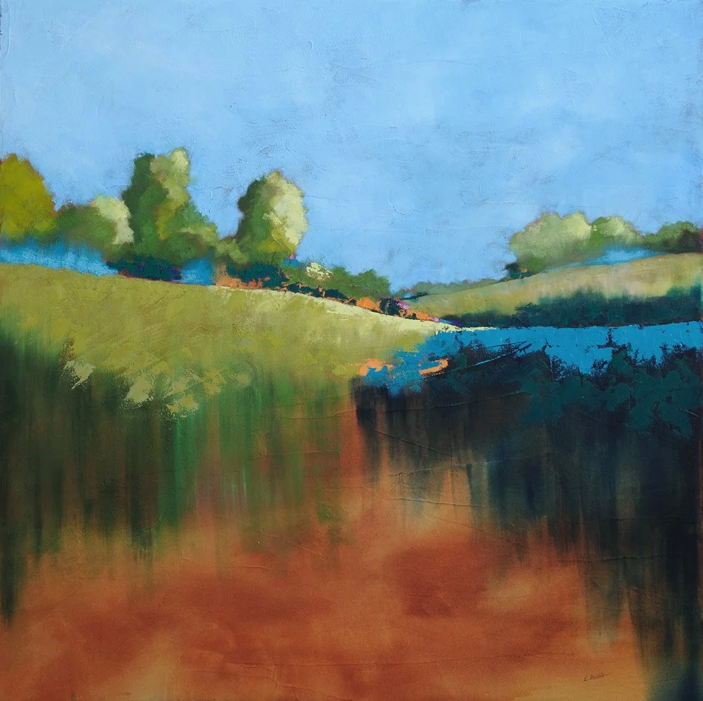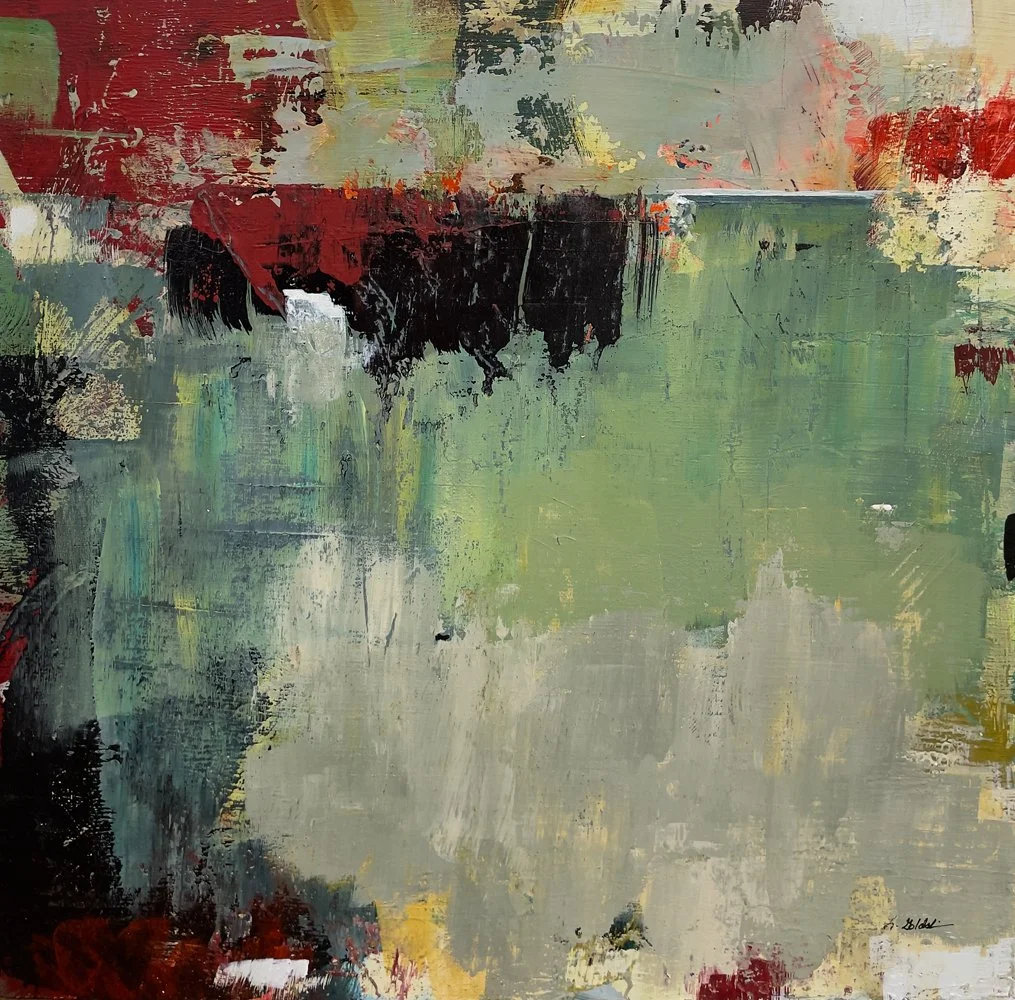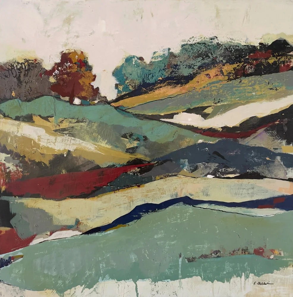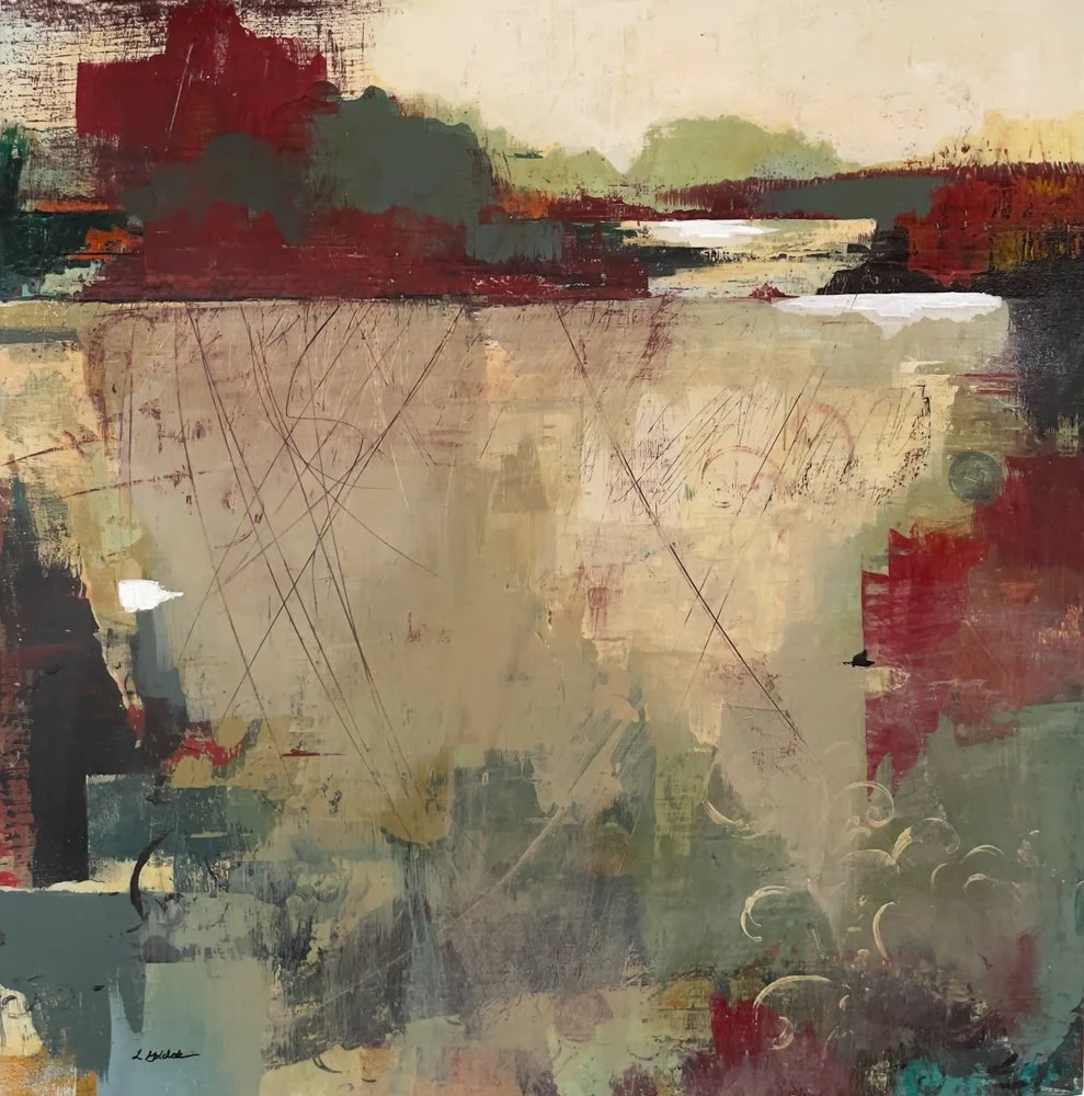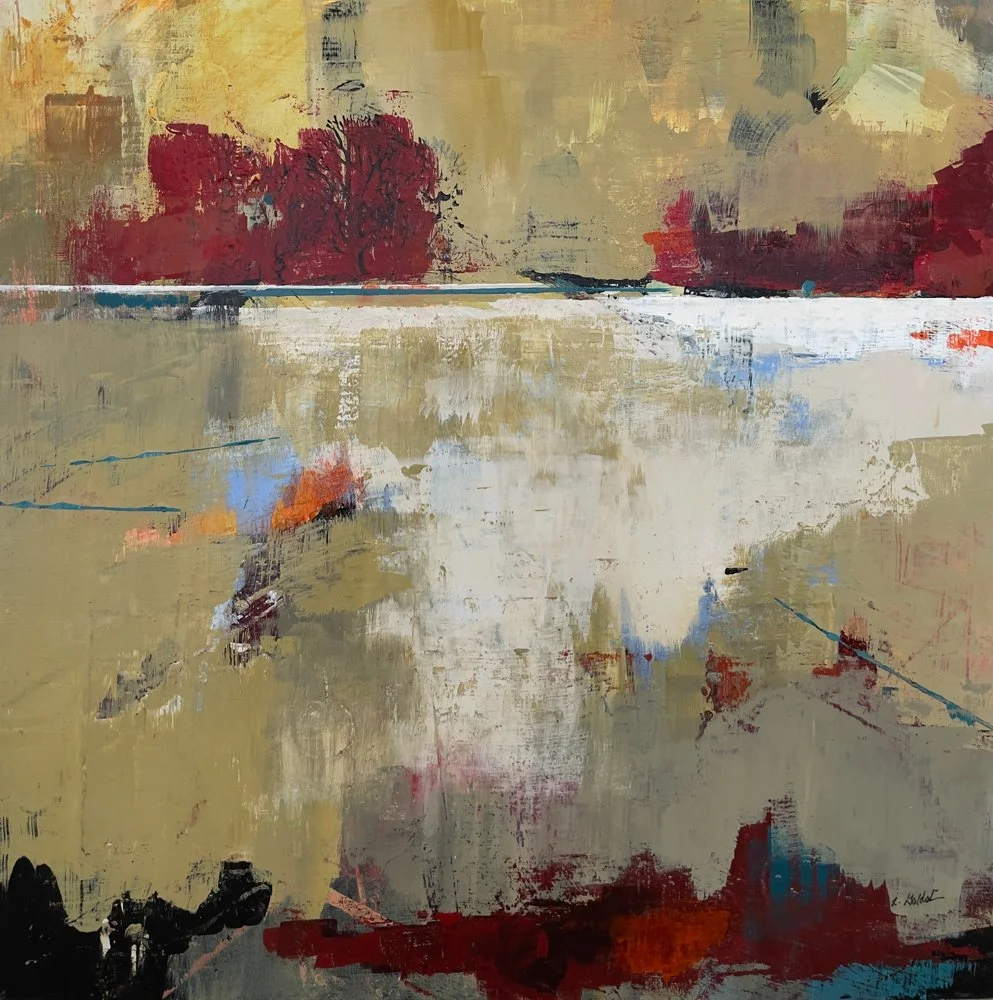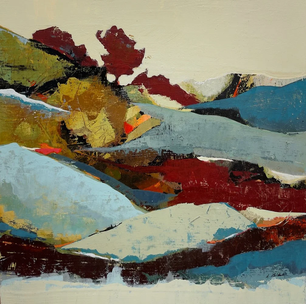 At one time, I was focused on capturing a sense of place in my landscape paintings, I now find myself more interested in the painting process and the feelings that bubble to the surface while I am working. This change in emphasis is a result itself of my fascination with distressed frescoes in Italy, peeling paint on walls of buildings, and the textures that are found in the natural environment. Growing up surrounded by mountains informs the choices I make in my art. Even when I am intending to create an abstract painting, landscape aspects creep in. My most recent series, entitled Surface Tension, includes elements of mountains, trees, and reflected water in a decidedly abstract way. My color choices are entirely intuitive, and I use tools that are not intended for art-making purposes. Trowels, silicon bowl scrapers, sandpaper, and chisels are some of the tools that I use to make the marks that contribute to the appearance of my finished art. By using these implements, I am able to emulate the textures that move me the most. There is magic in having less control of the final results.