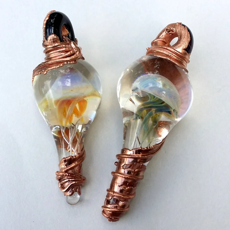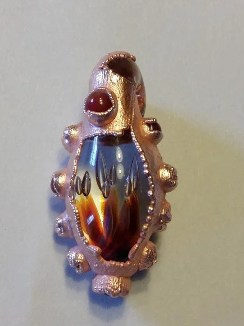 Tracey Howard works with both cold and warm glass, with a focus on creating expressive, handcrafted jewelry. In addition to her flameworking practice, she also explores the technique of electroforming—an intricate process of depositing copper onto glass surfaces to create detailed, sculptural effects. Her upcoming exhibit will focus on this process, offering an inside look at the tools, materials, and methods involved. Visitors will be able to view a range of electroformed glass objects, alongside descriptions and examples of the equipment used.