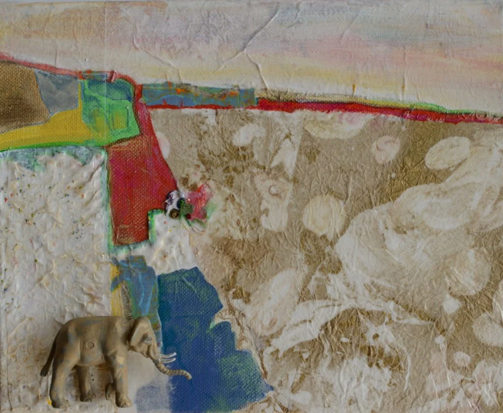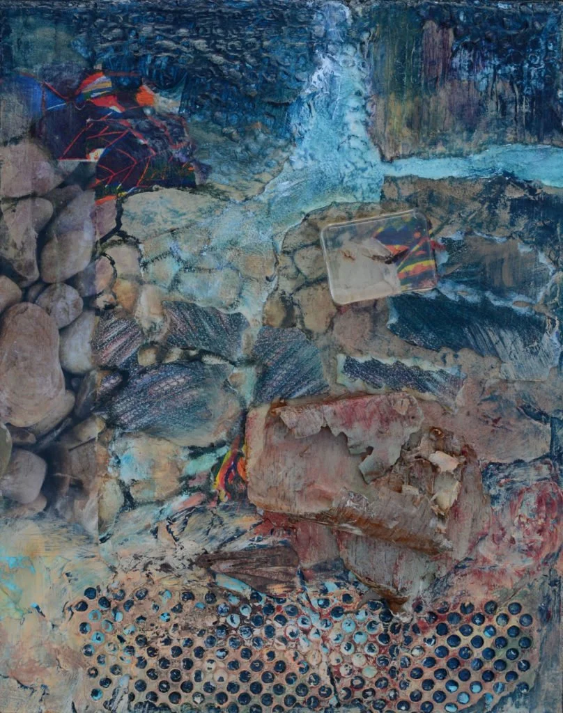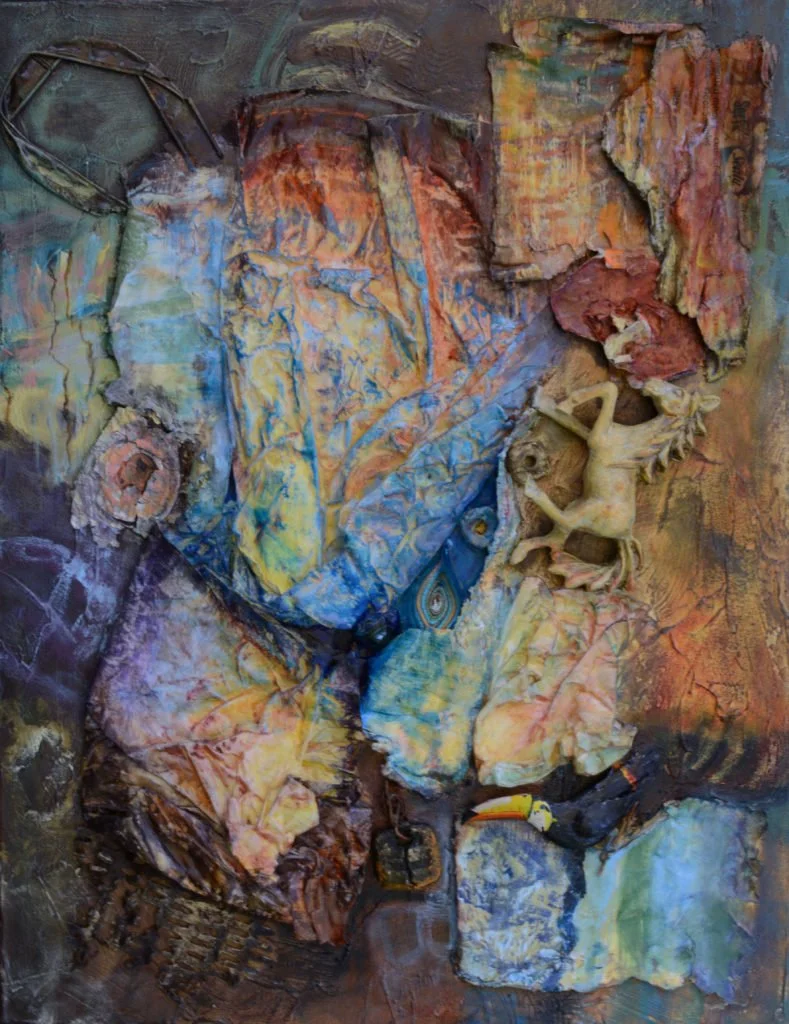 Tracie Oberle is a mixed media collage and assemblage artist. Her work features natural and manufactured objects collected from many sources. Family, friends, other artists and acquaintances donate their personal belongings to expand the trove of inspirational materials. You may find scraps of paper, small toys, or pieces of jewelry on the canvas. Keeping the items sorted and organized is a key component to the process. Acrylic mediums are used to create an enhanced environment to showcase the treasures.